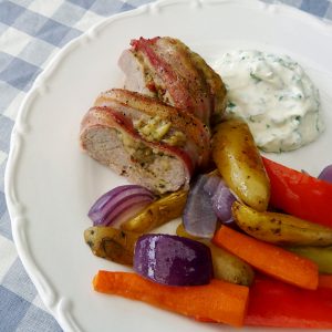Fylld fläskfilé med basilikakräm och rostade grönsaker